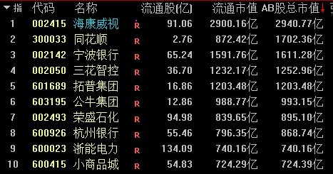 浙股(A股)总市值排行