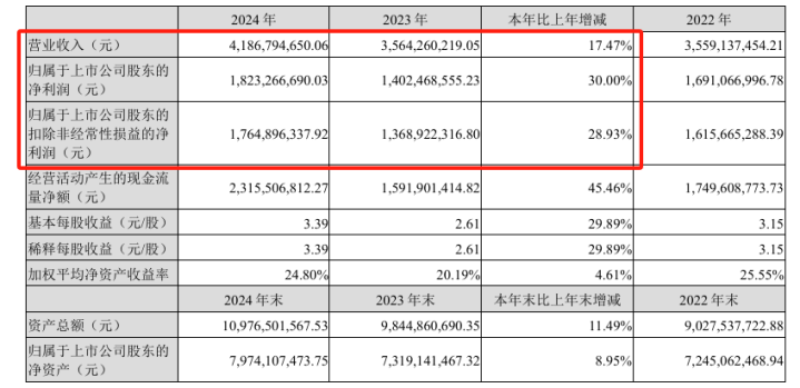 2月24日晚间,创业板上市公司同花顺发布浙股(A股,下同)首份2024年年报,公司全年实现营收41.87亿元,同比增长17.47%;净利18.23亿元,同比增长30%,扣除非经常性损益后净利17.65亿元,同比增长28.93%。